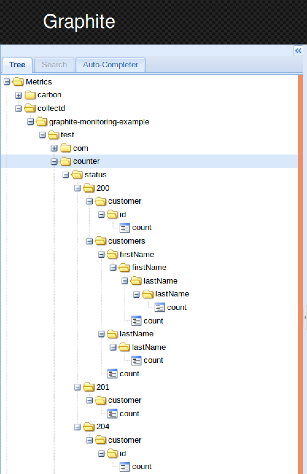 As you can see here all our data has been pushed to collectd/graphite-monitoring-example/test and is neatly organised per class and method. For the get method we can see that 1000 requests were made and 0 exceptions occurred. The exceptions are organised in a separate folder for each method if we used the @ExceptionMetered annotation.